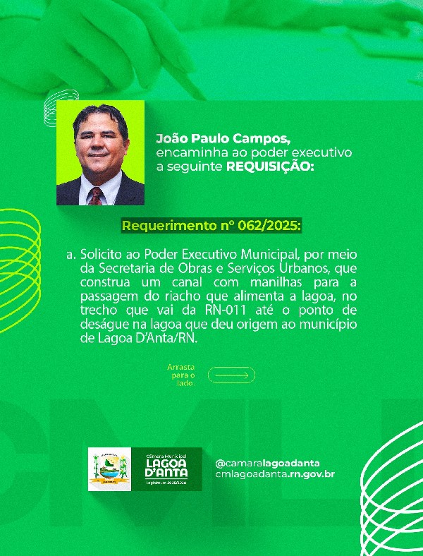 Confira o requerimento do vereador @ver.joaopaulocampos e o Projeto de Lei do Poder Executivo, na pauta da sessão de hoje nos cards acima!